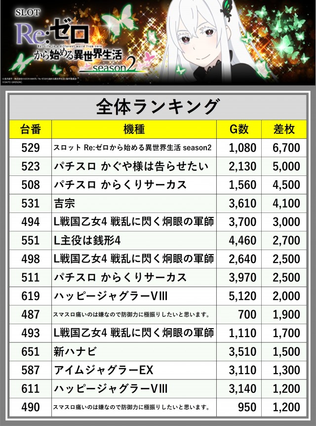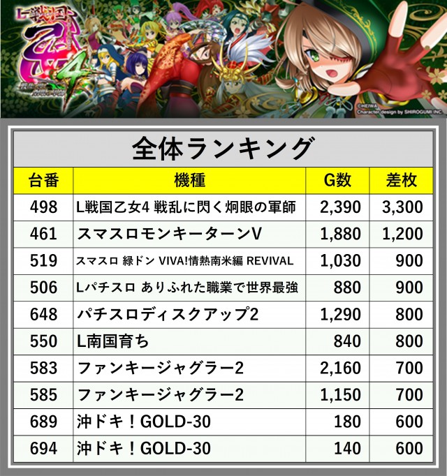 厳選された取材対象機種をはじめ、その他スロット全体から好記録が飛び出した!プレイヤーが楽しんだ1日を下記データにて振り返ってみて欲しい。