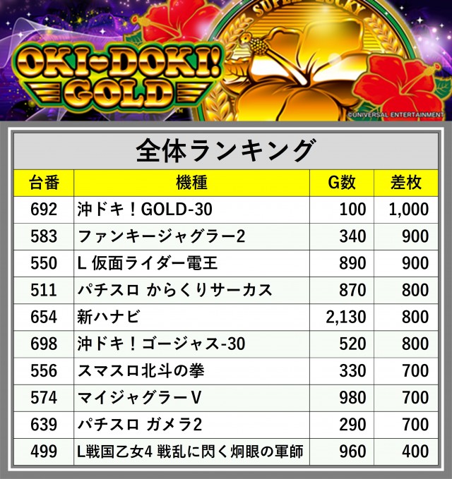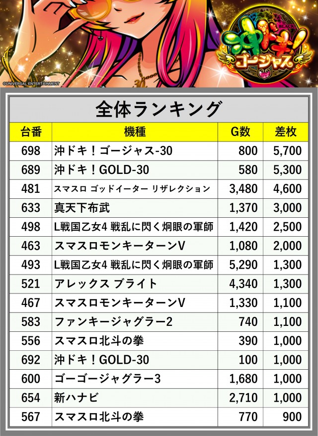 厳選された取材対象機種をはじめ、その他スロット全体から好記録が飛び出した!プレイヤーが楽しんだ1日を下記データにて振り返ってみて欲しい。
