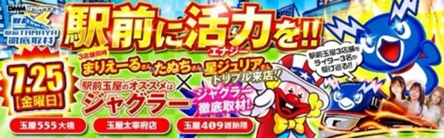 7月25日、「玉屋太宰府店」「玉屋409雑餉隈」「玉屋555大橋」の3店舗にて『駅前TAMAYA徹底取材』が合同実施された。当日の店内は、多くの人たちが集まり大盛況で、『ジャグラー』シリーズを中心に良台が店内のアチコチに出現していた。以下からは活躍した機種を紹介していくため、最後まで本レポートを最後までチェックしてもらいたい!