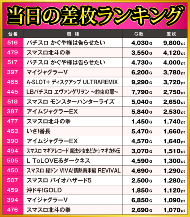 この日は、『パチスロ かぐや様は告らせたい』が+9,800pt、+4,000ptといった好成績を連発させ差枚TOP3に2台がランクイン。さらに、『スマスロ北斗の拳』が+4,120pt、『マイジャグラーⅤ』と『A-SLOT+ ディスクアップ ULTRAREMIX』が+3,000pt超を記録するなど、人気機種を中心にハイスコアが続出していた。