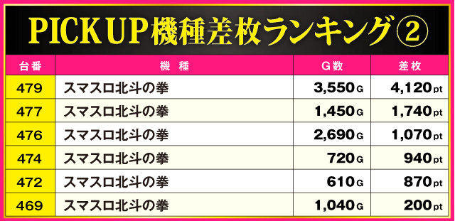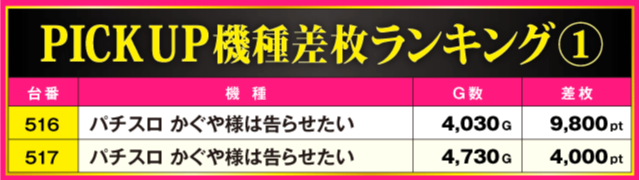 今回のPICK UP機種は『パチスロ かぐや様は告らせたい』と『スマスロ北斗の拳』の2機種で、差枚上位にランクインした台以外からも複数の好調台を確認。最終的に両機種合わせた全14台中8台がプラス差枚となっているだけに、ファンにとって充実の一日となったのは間違いないだろう。