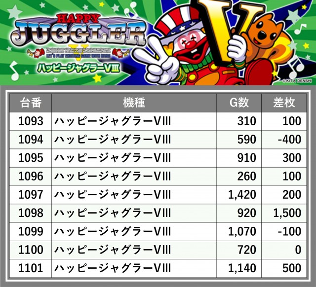 厳選された取材対象機種をはじめ、その他スロット全体から好記録が飛び出した!プレイヤーが楽しんだ1日を下記データにて振り返ってみて欲しい。