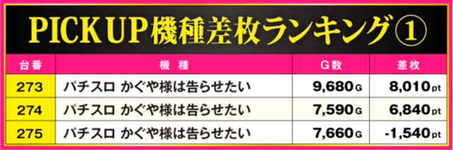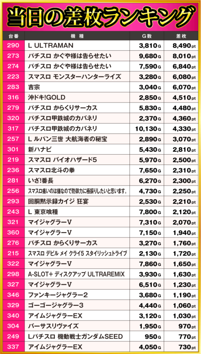 当日の差枚ランキング