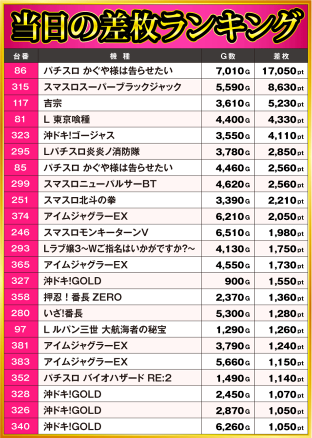 この日、最もプレイヤーの注目を集めたのが『パチスロ かぐや様は告らせたい』で、86番台が怒涛の+17,050ptを叩き出し差枚ランキングのトップに。次いで『スマスロスーパーブラックジャック』が+8,630ptを記録するなど、人気のスマスロを中心にハイスコアが続出し店内を盛り上げていた。