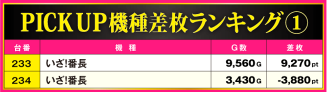 この日は、人気機種を中心に多数の好調台を確認。そんな中、『いざ!番長』が万枚目前の+9,270ptを叩き出しランキングトップに。また、ジャグラーシリーズも大奮闘しており、『マイジャグラーⅤ』の+3,460ptを筆頭に差枚TOP30に11台がランクインする盛況ぶりを見せている。