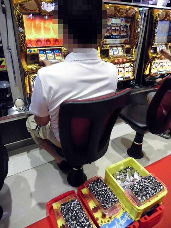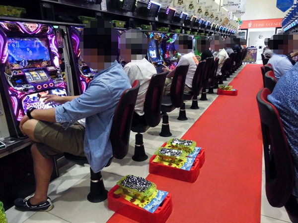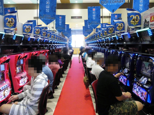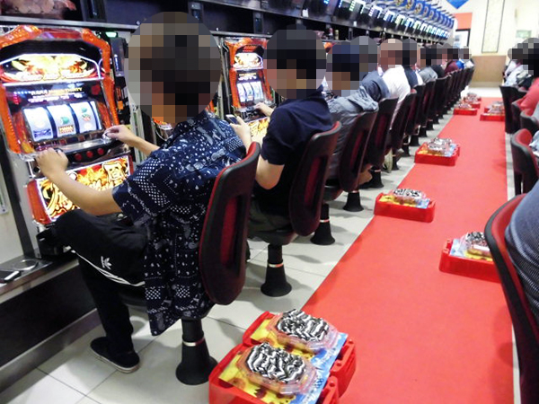 20円パチスロに目を向けると、朝に引き続き「ハナハナ鳳凰-30」などのハナハナシリーズや「バジリスク~甲賀忍法帖~絆」、「押忍!番長3」が盛況。シマ全体に華やかな光景が広がっていた。