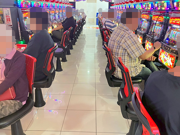 「アイムジャグラーEX」や「パチスロ からくりサーカス」、「スマスロ ゴッドイーター リザレクション」では、機種の魅力を堪能するプレイヤーを確認。シマ中に明るい雰囲気が広がっていた。
