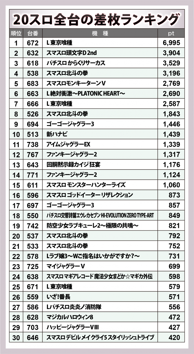 下で述べる3機種以外では、『L 東京喰種』に+7,000枚弱・+2,600枚弱が1台ずつ、『スマスロ頭文字D 2nd』に+3,900枚超、『パチスロ からくりサーカス』に+3,500枚超と、設置の多い少ないを問わずにスマスロが実力を発揮していた。