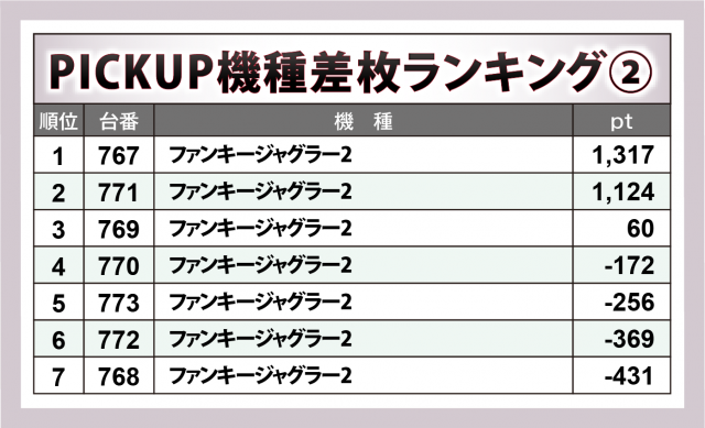 30台のうち4桁以上のプラスとなったのが15台、+2,000枚以上は7台、+3,000枚以上は4台、+6,000枚オーバーは1台と、確かに好成績は認められたが、内容的には過去回に叶わなかったのが正直なところ。