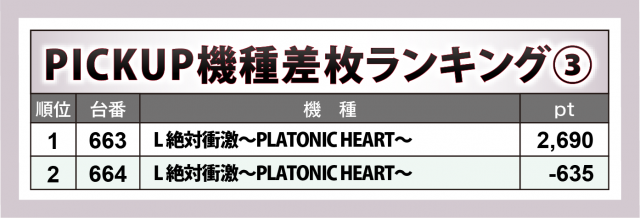また『L 絶対衝激~PLATONIC HEART~』では+2,700枚弱の台を輩出。