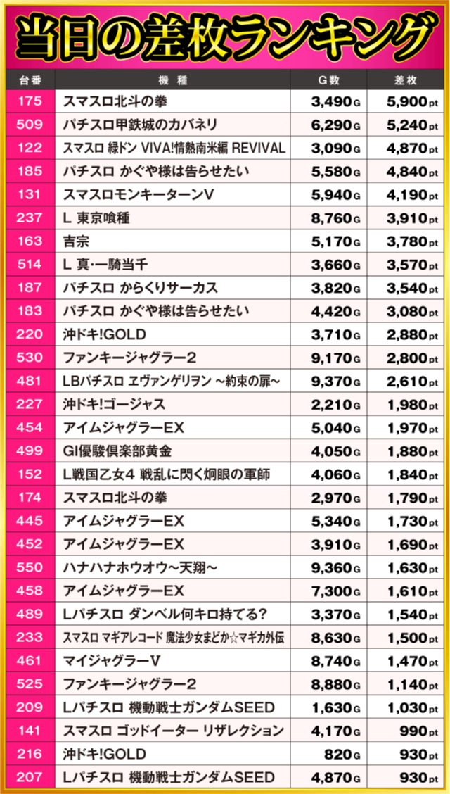 この日は、人気機種を中心にハイスコアが続出。そんな中、『スマスロ北斗の拳』と『パチスロ甲鉄城のカバネリ』+5,000pt超を記録しプレイヤーの注目を集めていた。また、ジャグラーシリーズも奮闘しており、『アイムジャグラーEX』をメインに差枚TOP30に7台がランクインする盛況ぶりを見せている。