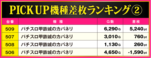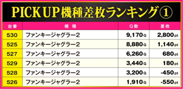 今回のPICK UP機種は全3機種で、差枚上位にランクインした台以外からも多数の好調台を確認。最終的に3機種トータルの全15台中9台がプラス差枚となっているだけに、それぞれのシマは常に活気とファンの笑顔に溢れ返っていた。