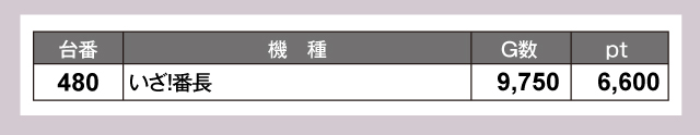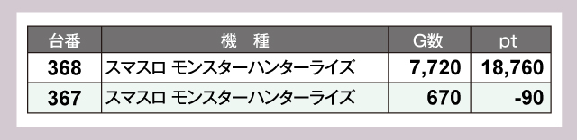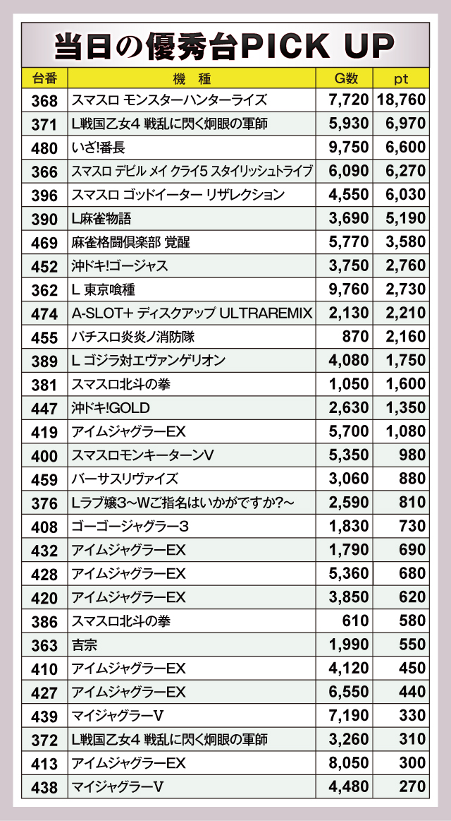 圧倒的輝きを放っていたのが『スマスロ モンスターハンターライズ』。368番台が+18,760ptと見事な成績を残している。そして『L戦国乙女4 戦乱に閃く炯眼の軍師』371番台の+6,970pt、『いざ!番長』480番台の+6,600ptを含む4台が6,000ptオーバーを達成。以下『L麻雀物語』390番台の+5,190ptなど、優秀台が多数確認できるデータとなっていた。
