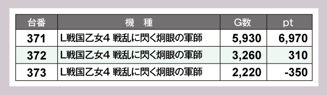 『L戦国乙女4 戦乱に閃く炯眼の軍師』は3台中2台がプラスptで、371番台の活躍が目立っていた。