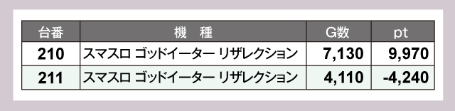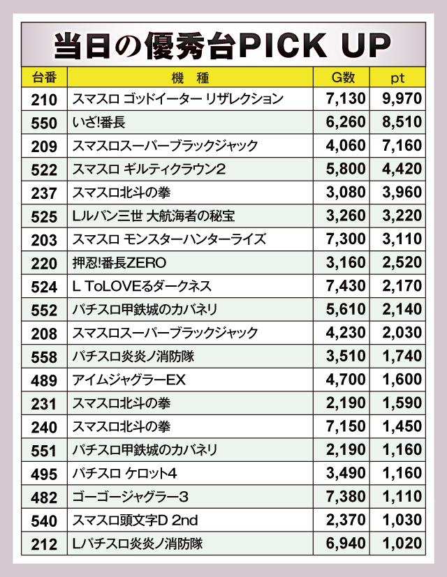 『スマスロ ゴッドイーター リザレクション』210番台が+9,970ptと、あと一歩で1万pt超えの大活躍だった。続いて『いざ!番長』550番台が+8,510pt、『スマスロスーパーブラックジャック』209番台が+7,160ptと好成績。以下にも、『スマスロ ギルティクラウン2』522番台の+4,420ptといった優秀台が多数誕生している。