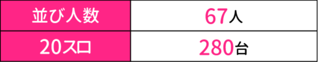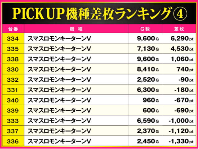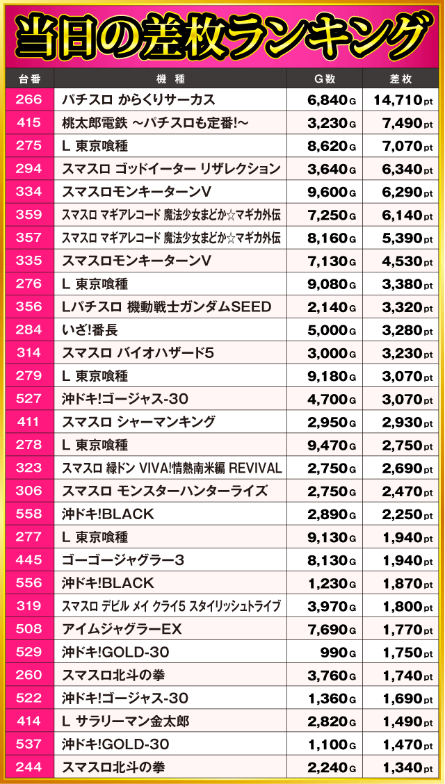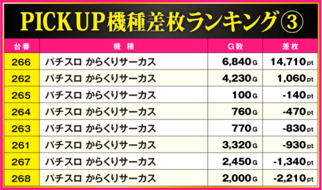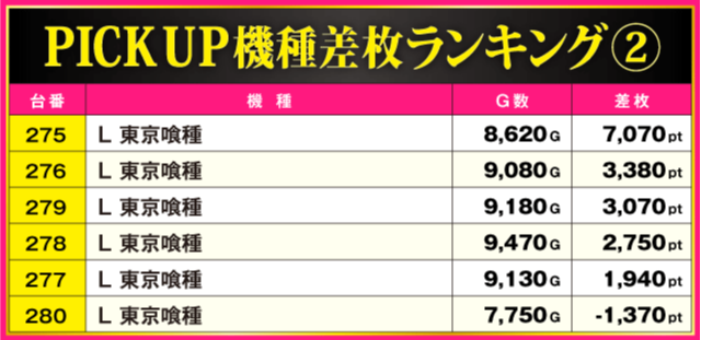 続いてPICK UP機種の状況をチェック!! 『パチスロ からくりサーカス』は+14,710pt、『スマスロ マギアレコード 魔法少女まどか☆マギカ外伝』と『スマスロモンキーターンV』は+6,000pt超を記録。さらに、『L 東京喰種』は+7,070ptを筆頭に全6台中5台がプラス差枚となる見事な結果を残している。