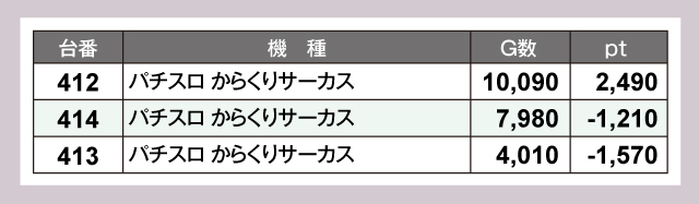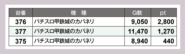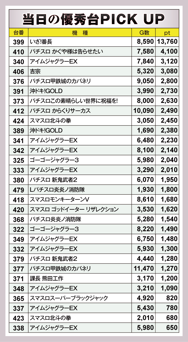 頭ひとつ抜けていたのは『いざ!番長』。399番台が+13,760ptと1万pt超えを果たしていた。次いで『パチスロ かぐや様は告らせたい』410番台が+4,100pt、『アイムジャグラーEX』340番台が+3,120pt、『吉宗』406番台が+3,080ptと並ぶ。以下にも『パチスロ甲鉄城のカバネリ』376番台の+2,800ptなど、たくさんの台が成果をあげていた。