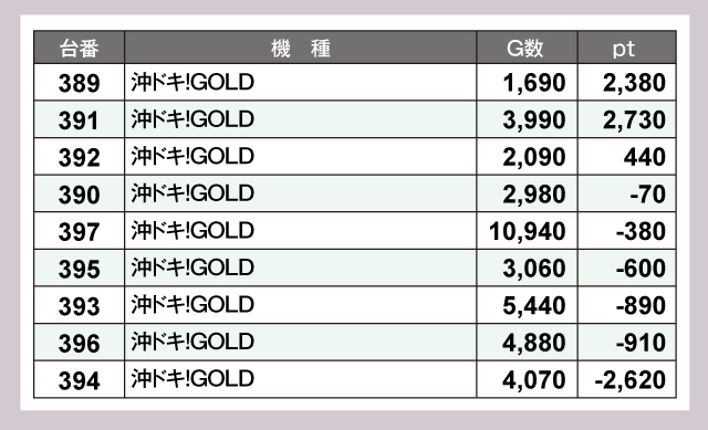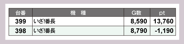 『いざ!番長』は2台とも8,000G超えとなっていて、399番台がとくにポテンシャルを発揮している。