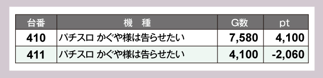 2台設置の『パチスロ かぐや様は告らせたい』は、7,000G以上まわされた410番台が優秀な成績をおさめていた。