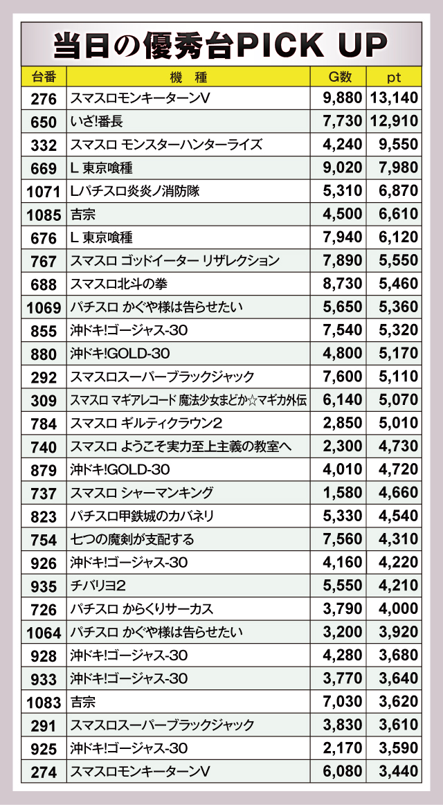 抜きん出た成績を残したのは2台。『スマスロモンキーターンV』276番台が+13,140pt、『いざ!番長』650番台が+12,910ptと1万ptを達成していた。そして『スマスロ モンスターハンターライズ』332番台が+9,550pt、『L 東京喰種』669番台が+7,980ptと負けず劣らずのptでつづく。以下にも多数の優秀台が誕生し、豪華なデータを見せてくれた。