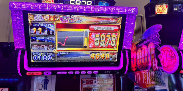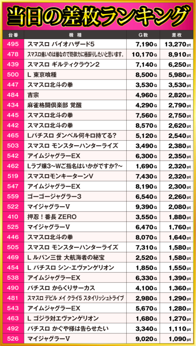 この日、最もプレイヤーの注目を集めたのが『スマスロ バイオハザード5』で、495番台が圧巻の+13,270ptを叩き出しランキングトップに輝いた。また、ジャグラーシリーズも大奮闘しており、『アイムジャグラーEX』を中心に差枚TOP30に8台がランクインする盛況ぶりを見せている。