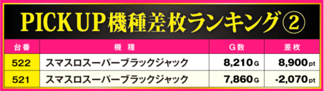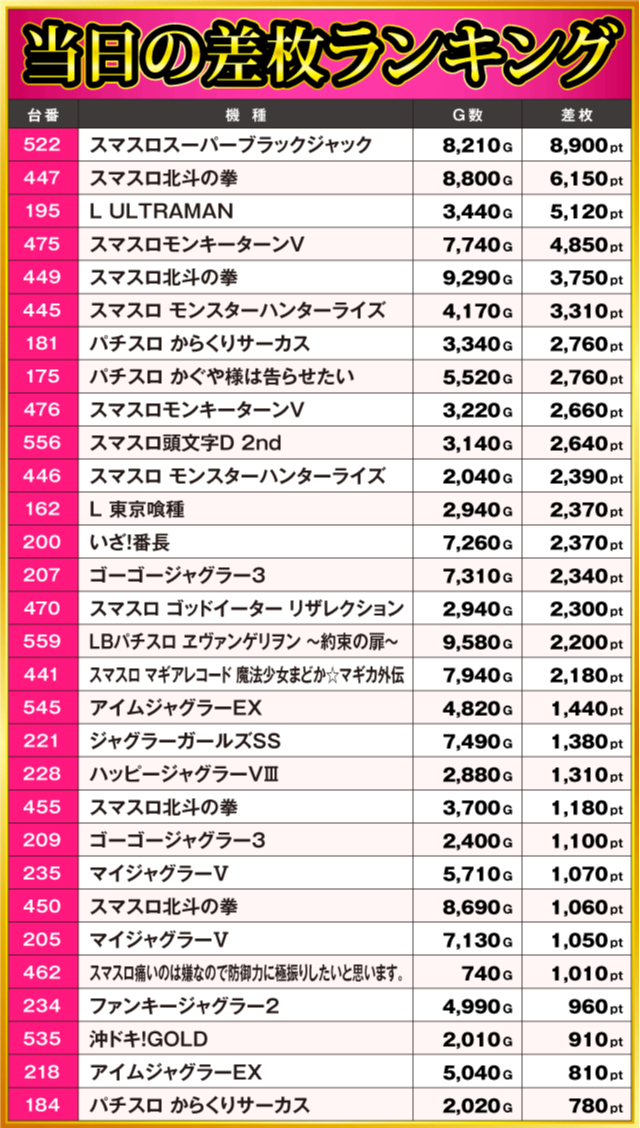 この日、最もプレイヤーの注目を集めたのが『スマスロスーパーブラックジャック』で、522番台が+8,900ptを叩き出しランキングトップに。次いで『スマスロ北斗の拳』が+6,150pt、『L ULTRAMAN』が+5,120ptを記録するなど、人気のスマスロを中心にハイスコアが続出していた。