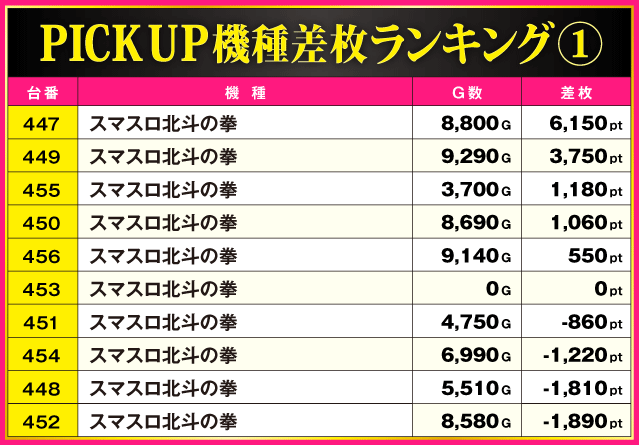今回のPICK UP機種は全3機種。ランキング上位機種以外にも『スマスロ モンスターハンターライズ』から+3,310pt、+2,390ptといった好成績を確認。しかも、3機種トータルの全16台中8台がプラス差枚となっているだけに、ファンにとって充実の一日となったのは間違いないだろう。