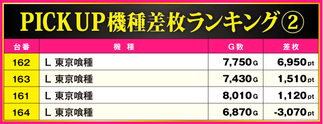 今回のPICK UP機種は『スマスロ マギアレコード 魔法少女まどか☆マギカ外伝』と『L 東京喰種』の2機種で、どちらも差枚ランキングで上位に入った台以外からも多数の好調台を確認。最終的に両機種合わせた全7台中6台がプラス差枚となっているだけに、ファンにとって充実の一日となったのは間違いないだろう。