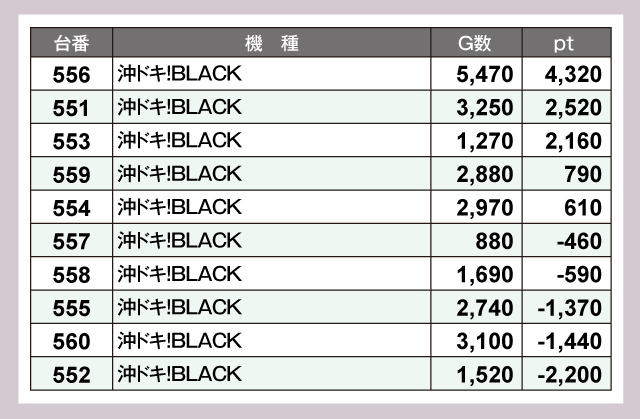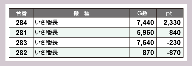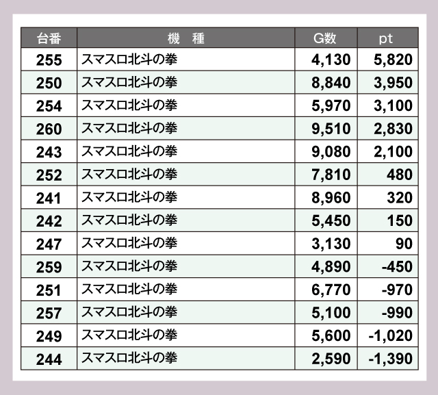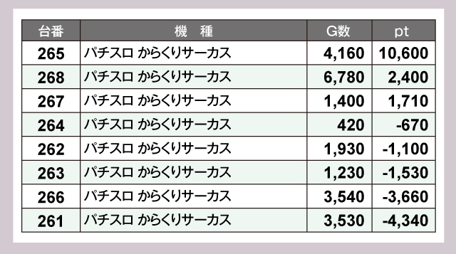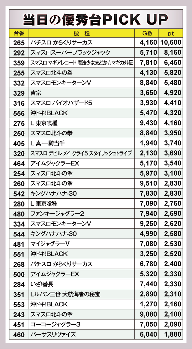 とくに目立ったのは『パチスロ からくりサーカス』。265番台が+10,600ptと、見事に1万ptオーバーを達成している。次いで活躍したのが『スマスロスーパーブラックジャック』292番台で+8,160pt。そして『スマスロ マギアレコード 魔法少女まどか☆マギカ外伝』359番台の+6,450pt、『スマスロ北斗の拳』255番台の+5,820ptと並び、この日の盛り上がりをしっかりと示していた。