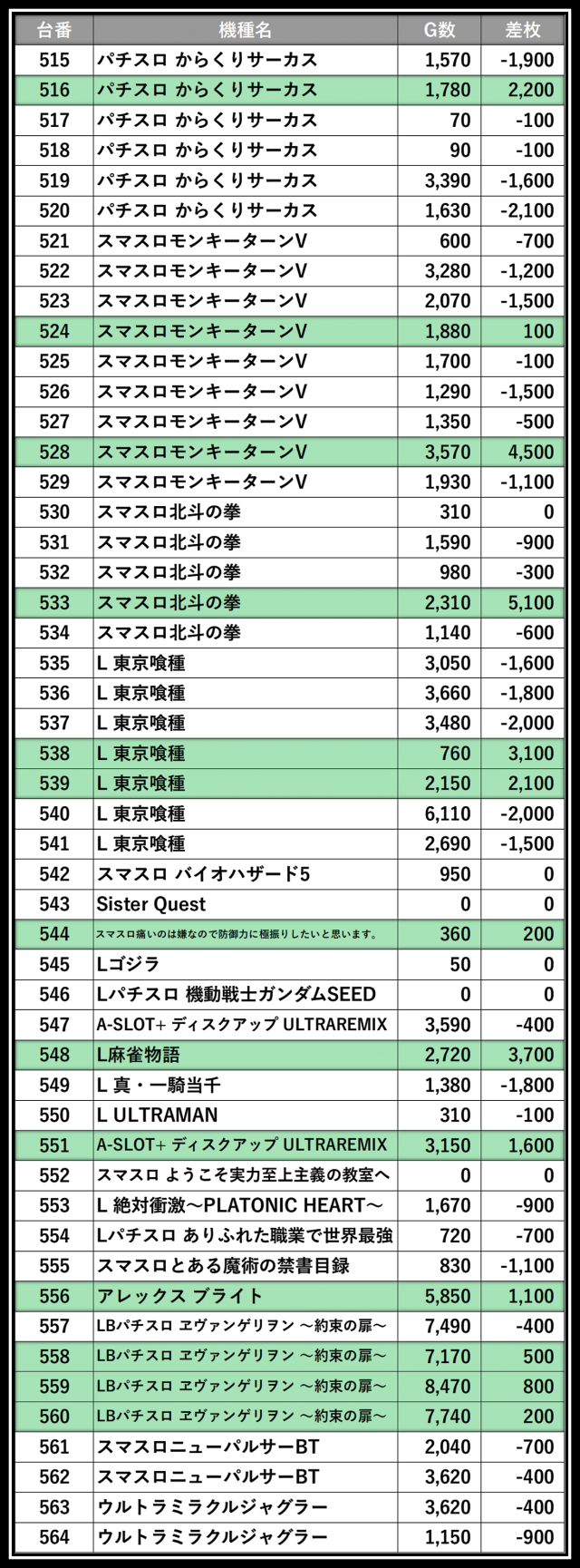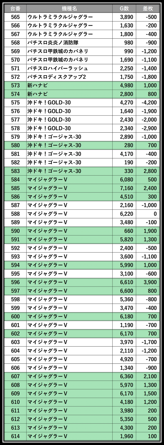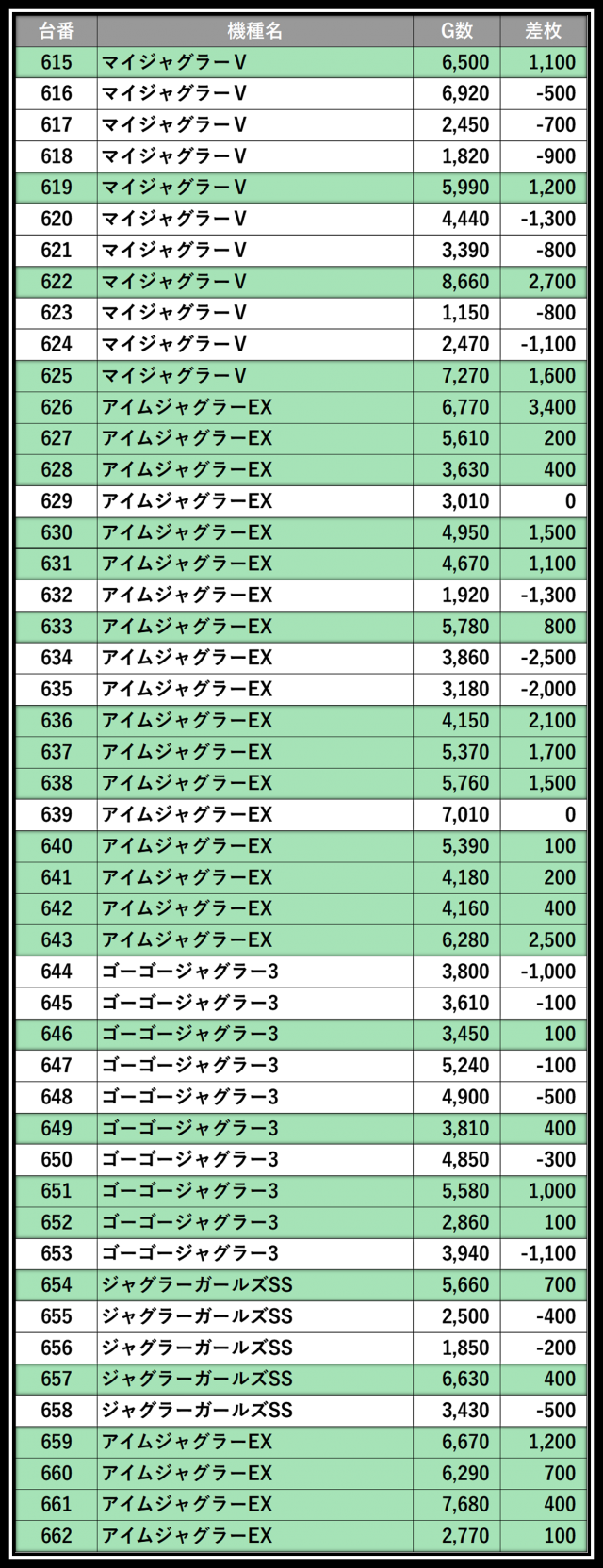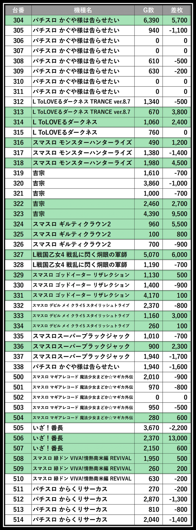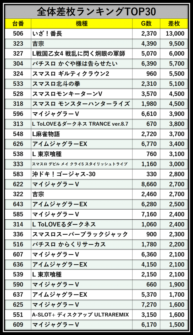 ※差枚数順に掲載しています