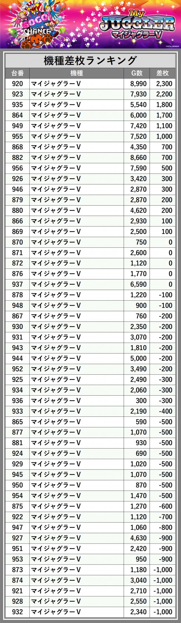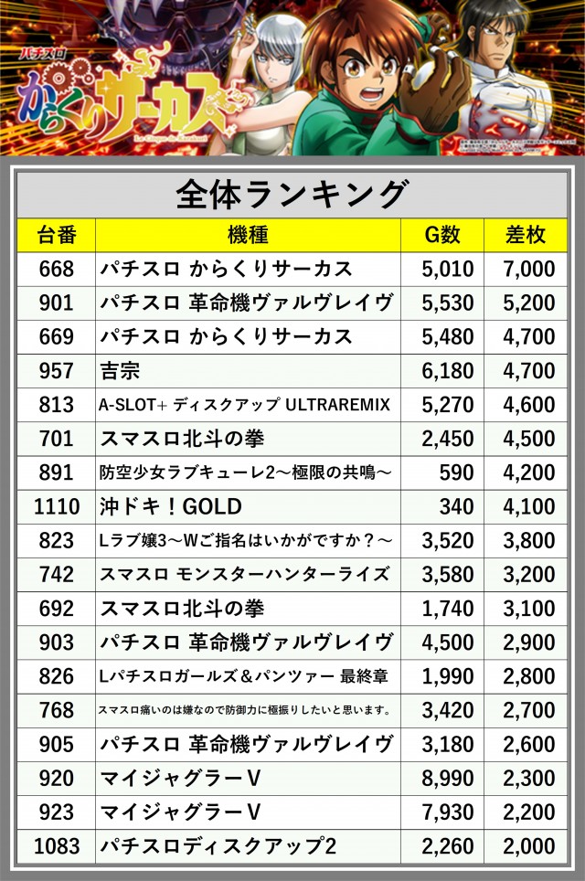 厳選された取材対象機種をはじめ、その他スロット全体から好記録が飛び出した!プレイヤーが楽しんだ1日を下記データにて振り返ってみて欲しい。