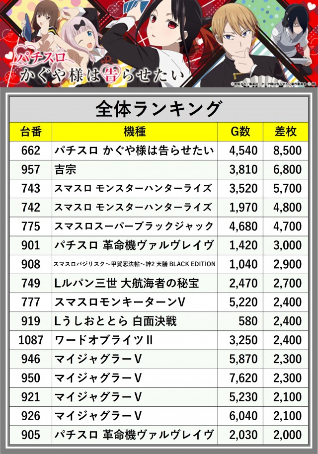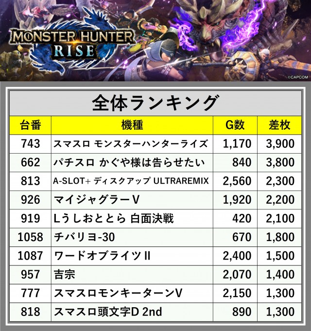 厳選された取材対象機種をはじめ、その他スロット全体から好記録が飛び出した!プレイヤーが楽しんだ1日を下記データにて振り返ってみて欲しい。