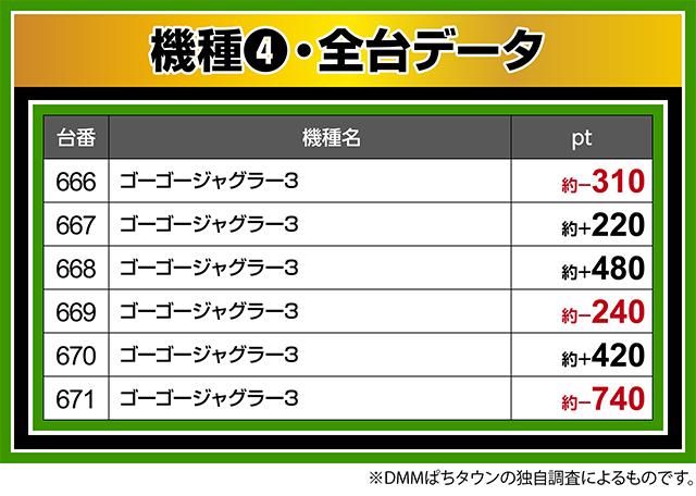 『ゴーゴージャグラー3』では、稼働率の高かった3台が結果を残した。
