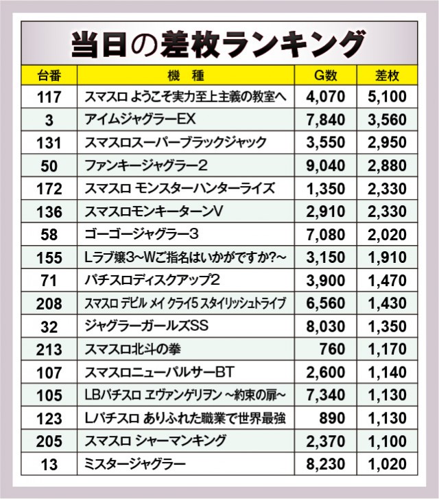 当日は『スマスロ ようこそ実力至上主義の教室へ』が+5,100枚と大台突破を果たし、店内の盛り上がりを牽引する存在となっていた。注目のBT搭載機『LBパチスロ ヱヴァンゲリヲン ~約束の扉~』も名を連ねており、閉店までじっくりと打ち込まれた様子も見逃せない。また『ジャグラー』シリーズもコンスタントに大当りを積み重ね、『アイムジャグラーEX』から+3,560枚と気を吐く活躍を披露していたのも鮮烈だ。