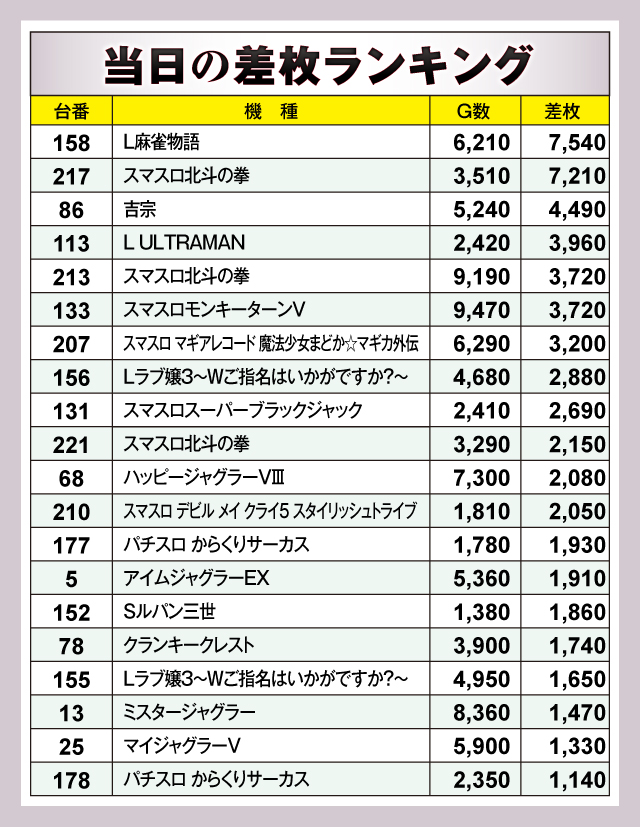 それでは差枚ランキングのチェックをしていこう。全20台のうち12台が+2,000枚オーバーを記録し、+3,000枚オーバーは7台出現! それらのなかでもっとも優秀だったのは、158番台の「L麻雀物語」で、差枚は+7,540枚を獲得! その他ランクイン機種には、スマスロなどのハイスペック機種が活躍するなかジャグラーシリーズも多数ランクイン。人気機種から定番機種まで店全体にチャンスが隠されていたようだ!