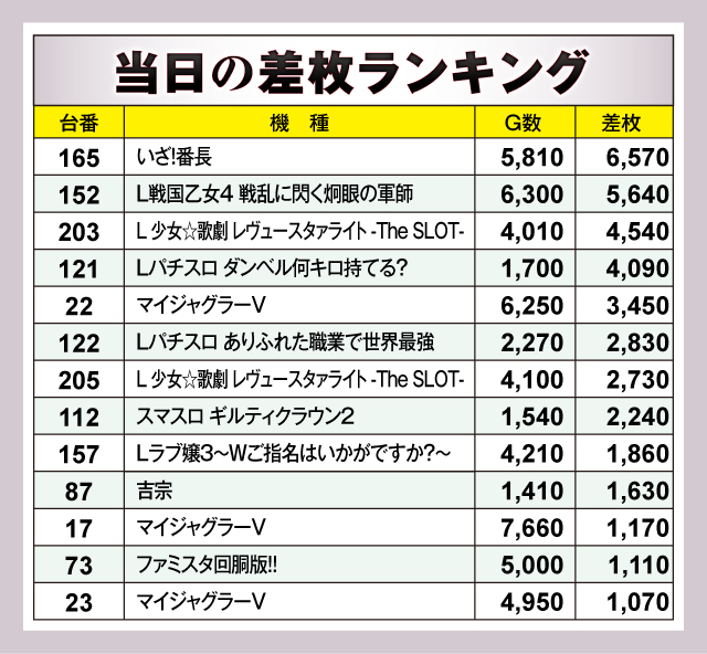 まずは当日の差枚ランキングのチェックから。13台のうち8台が差枚+2,000枚オーバーで、それらのなかでもっとも優秀だった台は、165番台の「いざ!番長」で、差枚は+6,570枚を獲得! 人気スマスロ機から最新機種、ジャグラーシリーズまで様々な機種が盛り上がりを見せていた!