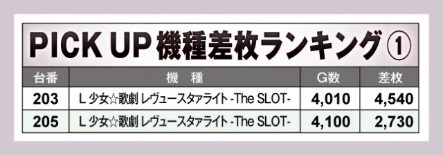 続いては、当日とくに盛り上がっていた「L 少女☆歌劇 レヴュースタァライト -The SLOT-」を紹介していこう。ピックアップした2台どちらも+2,000枚を超える活躍で、203番台は+4,540枚と素晴らしい結果を残していた。もちろんその他機種を含め、店内全体が活気に溢れていたぞ!