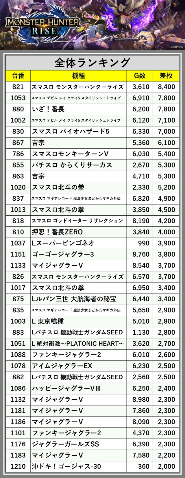厳選された取材対象機種をはじめ、その他スロット全体から好記録が飛び出した!プレイヤーが楽しんだ1日を下記データにて振り返ってみて欲しい。