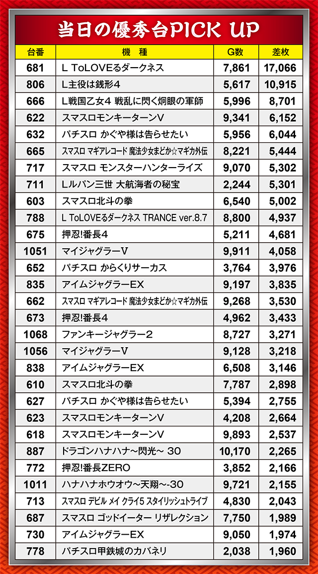 10,000枚オーバー記録の生まれなかった前回から一転、この日は2台の10,000枚超えレコードと遭遇することとなった。今回もさまざまな機種からたくさんのプラス差枚が生まれており、これまでと遜色ない結果を披露。『ジャグ』&『ハナハナ』シリーズから好結果が複数生まれているのもおなじみの光景だ。