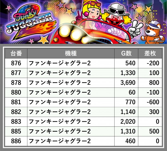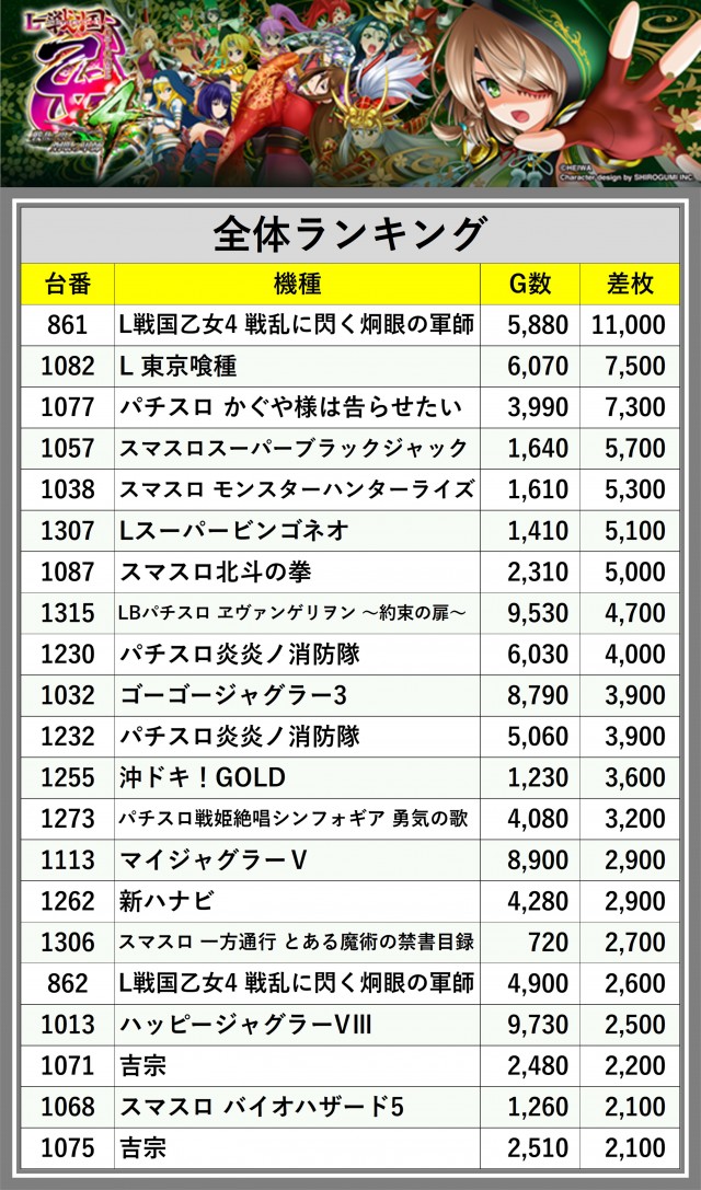 厳選された取材対象機種をはじめ、その他スロット全体から好記録が飛び出した!プレイヤーが楽しんだ1日を下記データにて振り返ってみて欲しい。