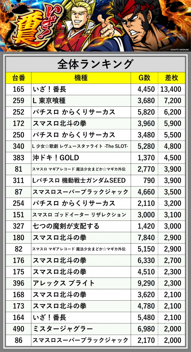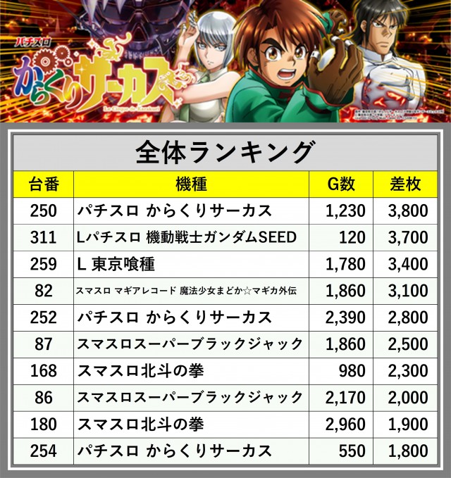 ※差枚数順に掲載しています