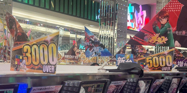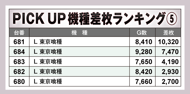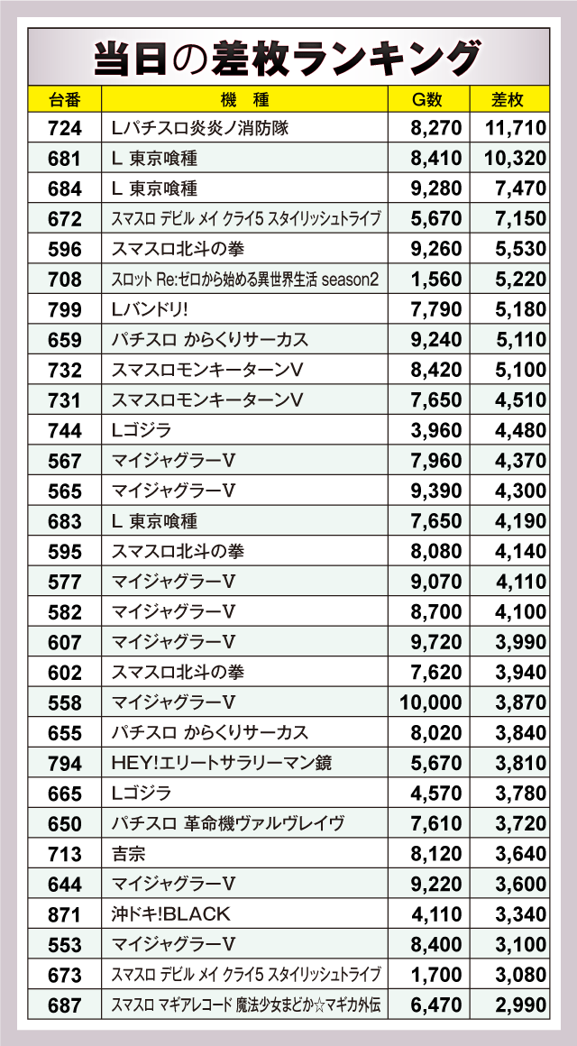 この日は、人気のスマスロを中心に多数の好調台が確認された。そんな中、『Lパチスロ炎炎ノ消防隊』が万枚超の+11,710枚を叩き出しランキングトップに輝いている。さらに、『L 東京喰種』が+10,320枚、+7,470枚を記録。差枚ベスト3に2台がランクインする勢いを見せプレイヤーの注目を集めていた。