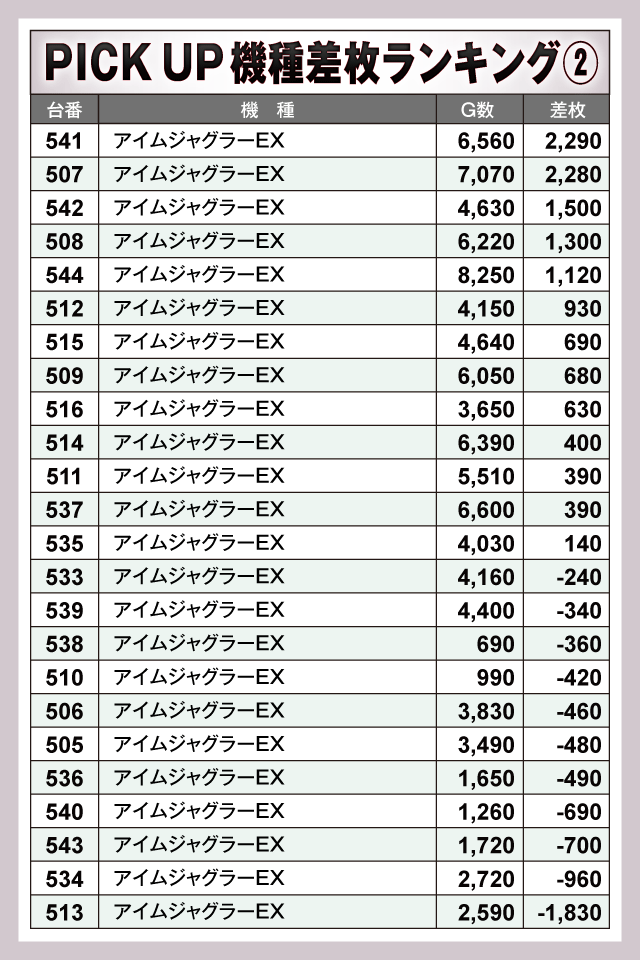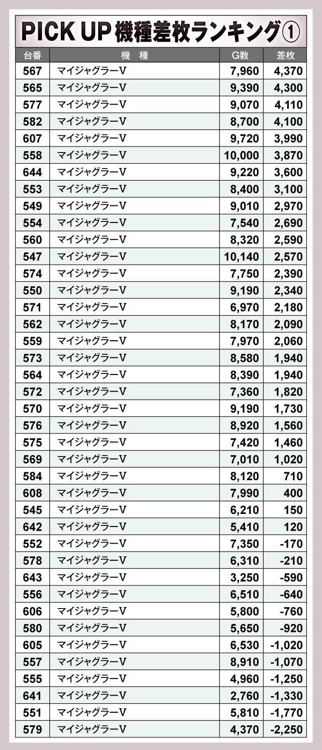 今回のPICK UP機種は、メイン機種の一つでもあるジャグラーシリーズ。特に目立っていたのが『マイジャグラーⅤ』で、+3,000枚超が8台も発生する盛況ぶりを披露していた。また、その他の機種からも好成績が続出しており、最終的に4機種トータルの全96台中56台がプラス差枚となる圧巻の結果を残している。