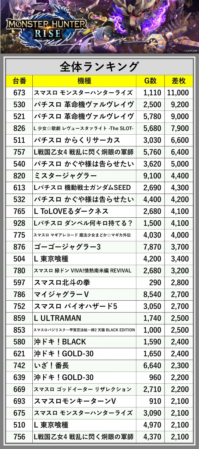 厳選された取材対象機種をはじめ、その他スロット全体から好記録が飛び出した!プレイヤーが楽しんだ1日を下記データにて振り返ってみて欲しい。