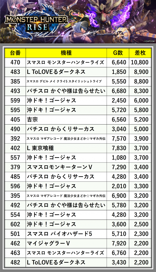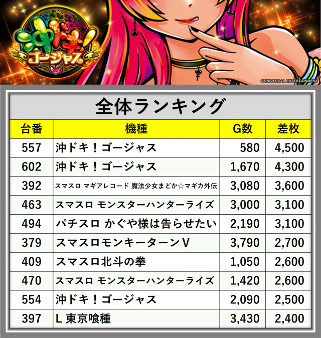 厳選された取材対象機種をはじめ、その他スロット全体から好記録が飛び出した!プレイヤーが楽しんだ1日を下記データにて振り返ってみて欲しい。