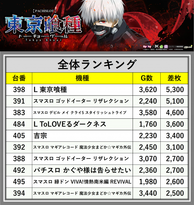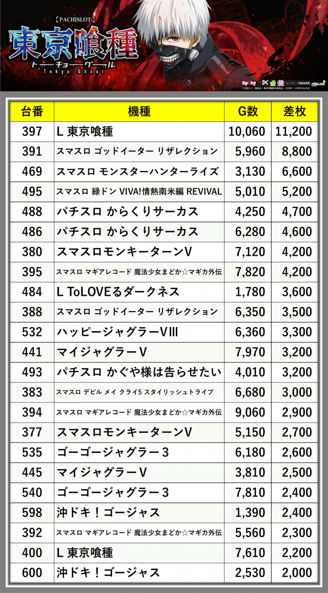 ※差枚数順に掲載しています