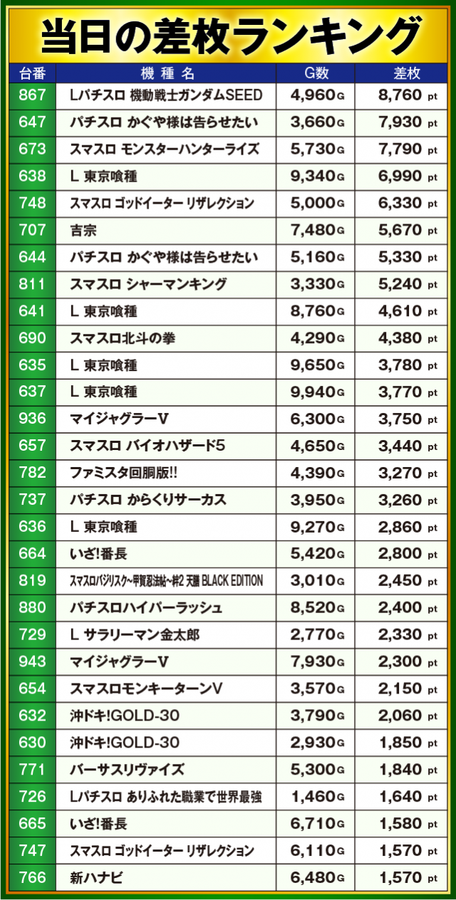 レポートの最後に「Super D’STATION倉賀野店」の差枚ランキングも掲載!