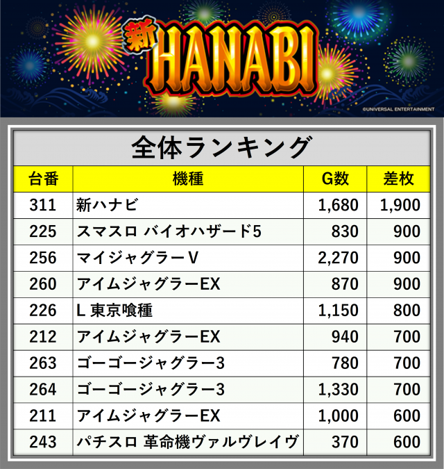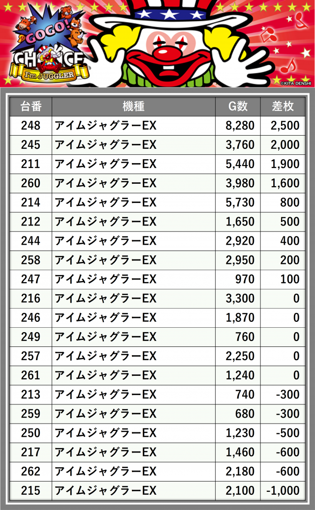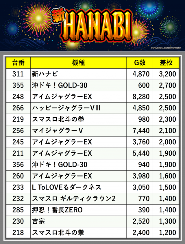 厳選された取材対象機種をはじめ、その他スロット全体から好記録が飛び出した!プレイヤーが楽しんだ1日を下記データにて振り返ってみて欲しい。