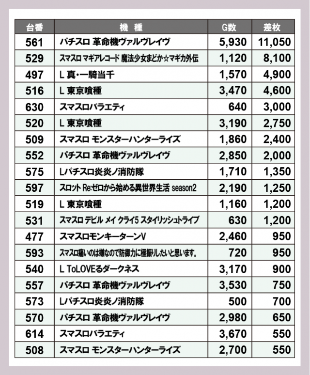 ※差枚数順に掲載しています