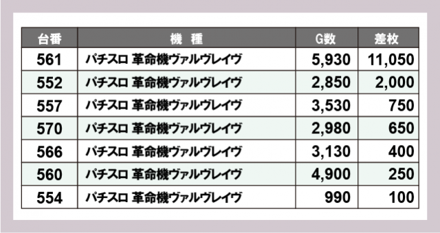 ヴァルヴレイヴ差枚ランキング